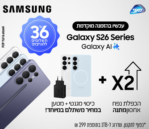קונים עכשיו Galaxy S26 Series ומקבלים הכפלת נפח אחסון מתנה בכפוף לתקנון, שדרוג ל-1TB בתוספת 299 ₪ + כיסוי מגנטי ומטען במחיר משתלם במיוחד!